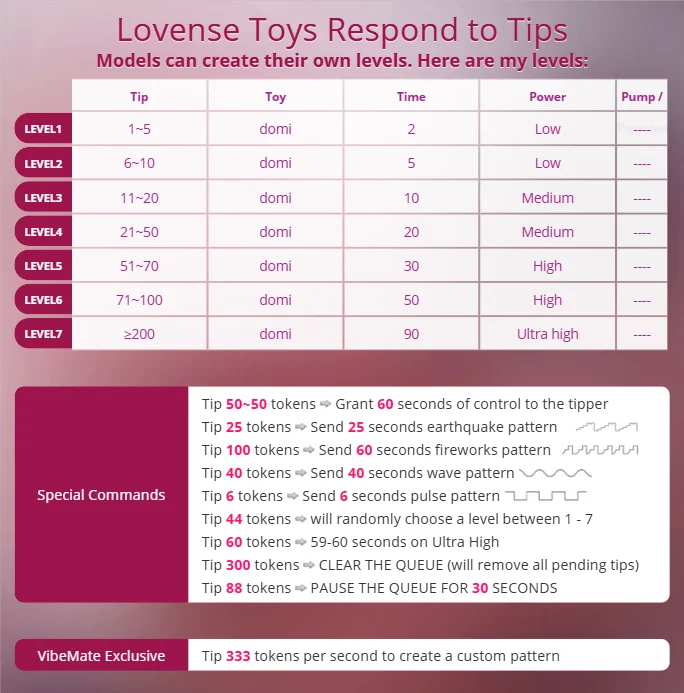 섹스 기구, 스모킹, 스팽킹, 상의탈의, 젖치기, 핑거링, 플래싱, 자위, 자지 평점, 풋 페티시, 오일 쇼, 오르가즘, 스트립쇼, 트월킹, 치마속, 카멜토우, 애널 기구, 엉덩이에서 입까지, 딥스로트, 딜도 또는 바이브레이터, 더블 페네트레이션, 게이핑, 미스트레스(여주인), 롤플레이, 분수
